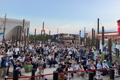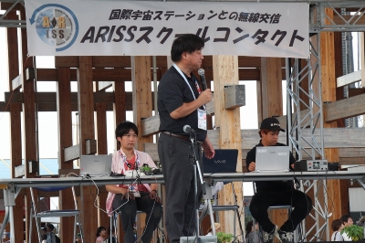 本イベントは、NASAと大阪・関西万博の公式イベントの1つとして、万博会場内の「ホップアップステージ北」で開催され、当日は森田JARL会長も駆けつけ、関西ARISSプロジェクトチームの運営により、シンガーソングライターでJARL広報大使のMasacoさん(JH1CBX)の司会進行のもと、カウントダウンの後、18:47から大西宇宙飛行士との交信が始まりました。