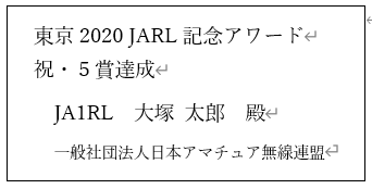 東京2020 JARL記念アワードの5賞(TOKYO 2020・TOKYO 2020 D-STAR・TOKYO 2020 Japan・TOKYO2020 World・TOKYO 2020 Special)を得た方を対象に、左の写真の「5賞達成記念オーナメント」(H165×W90mm)を、希望者の方に有償頒布します。 東京2020 JARL記念アワードの5賞を完成された方は、「コールサイン・氏名」をプレートに刻印したオーナメントを記念にいかがでしょうか。 このオーナメントを希望される方は、JARL会員課アワード係までお申し込みください。 なお、コールサインとお名前を刻印する関係で、お申し込みをいただいてから発送まで2ヶ月前後かかる場合がありますので、あらかじめご了承ください。 |