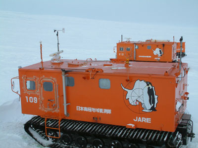 ■南極リポート(第8回) 『日照が長い夏に向かって』 ずいぶんと日が長くなりました。わずか1.5ヶ月ほどの極夜が明けたときはあれほど懐かしがったお日様ですが、すでに起きたときには日は昇り、夕食も明るいうちに食べるようになりました。 気温も上がり、−15℃程度で風のない時などは外で作業をしていると汗ばんできます。かといって着ている物を脱ぐとやっぱり寒く、服装に注意しないと体調を崩しそうです。暖かくなると動物も活動を始め、皇帝ペンギンやアザラシも昭和基地付近に現れるようになりました。ただ、こうした懐かしい生き物が昭和基地を訪問するときに限って仕事で外に出ることが出来ず、皇帝ペンギンも豆粒のような姿を通信室から眺めただけでした。 そのかわり寒いと思っていたシャックのある管理棟1階もずいぶん過ごしやすくなりました。寒さに少し慣れたようなのですが、今年の日本の猛暑を考えると、来年日本に帰ったときちゃんと暮らしていけるか少し不安です。 日が延びると共にコンディションも変わってきて、21MHzのR.JAPANも10時LTからきれいに聞こえるようになり、19時LT頃にはヨーロッパ方面のアマチュア無線の電波が入感するようになりました。ただ、ノイズは相変わらずで、こちらの電波は届いているようなのですが相手側のコールサインさえ聞き取ることができず30分もすると疲れ果ててしまいます。 最近は10MHz帯から24MHz帯までのんびりとCQを出しますが日本語の交信が聞こえるとほっとします。SSTVもCQを数回出してみたのですがこちらの方は全然だめで、帰るときまでになんとか交信できればと思っています。 上記のとおり、動物の写真は今回も撮れませんでした。今回は雪上車(SM100型 写真はSM109及びSM112、自重11.5トン・運用最低温度−60℃・最高速度21Km/h・全長約6m・幅約3.5m・高さ約3.2m HF・VHF・UHF各無線機とレーダ・GPSを装備)です。10月は野外調査の手伝いに出ますのでそのときに。 |