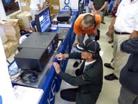 本番の時刻を前にして、会場には続々と人が集まり。観衆は報道陣含め約600人。小学校のセレモニーの後、最終リハーサルが入念におこなわれました。これは余談ですが、リハーサルの際に交信のお相手をする「ニセ宇宙飛行士」(!?)の、ユニークな回答が子供たちに受けていたようです。このとき「ニセ宇宙飛行士」は2名待機していましたが、1号はしゃべり過ぎで交信が長くなるので、2号に選手交代して入念なリハーサルをおこない本番に臨みました。