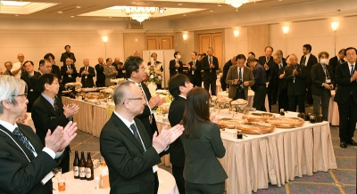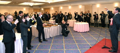 続いて、日本アマチュア無線機器工業会(JAIA)鈴木昭 会長(JF1QCI)に乾杯のご発声を頂き、さらに、一般財団法人 日本アマチュア無線振興協会(JARD)種村一郎会長(JG2GFX)から祝辞をいただきました。