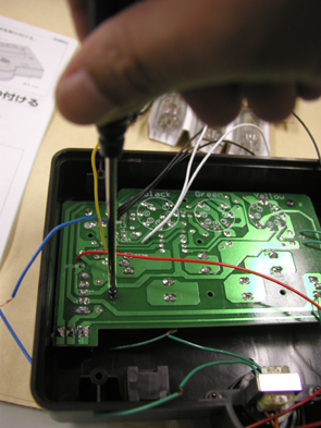 説明書では、所定の各線を巻き付けて、セロテープで絶縁固定するように説明がありますが、ハンダごてが使える方は、きちんとハンダ付けをしてから、ビニールテープなどで絶縁することをおすすめします。上級者の方は、引き出し済みのリード線を使わず、所定の配線を、直接基板にハンダ付けしてもいいでしょう。